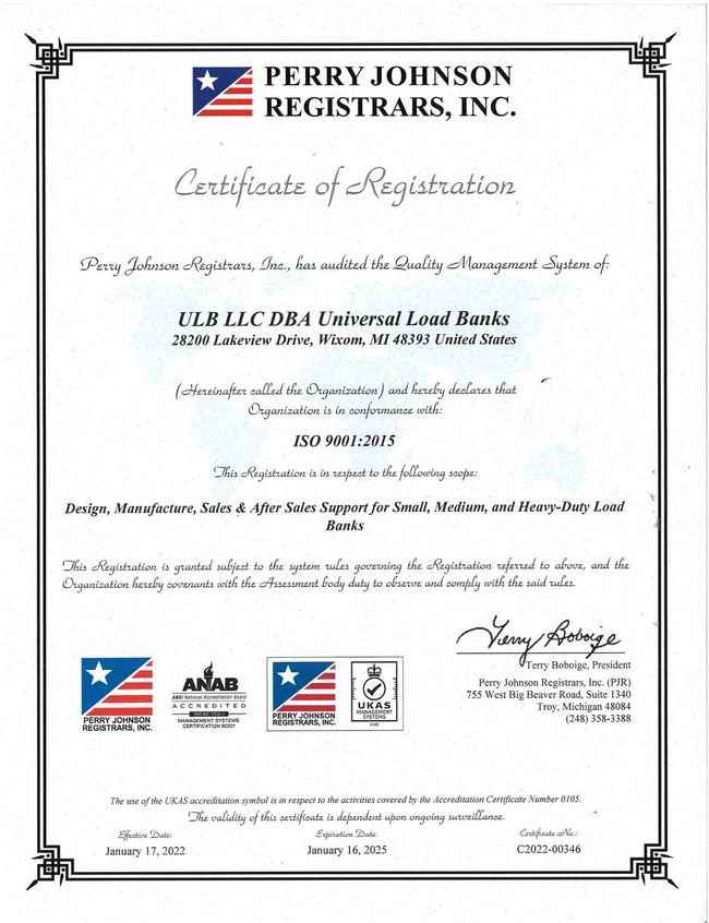 In January, 2022, Universal Load Banks was certified as being ISO 9001:2015 compliant by Perry Johnson Registrars.